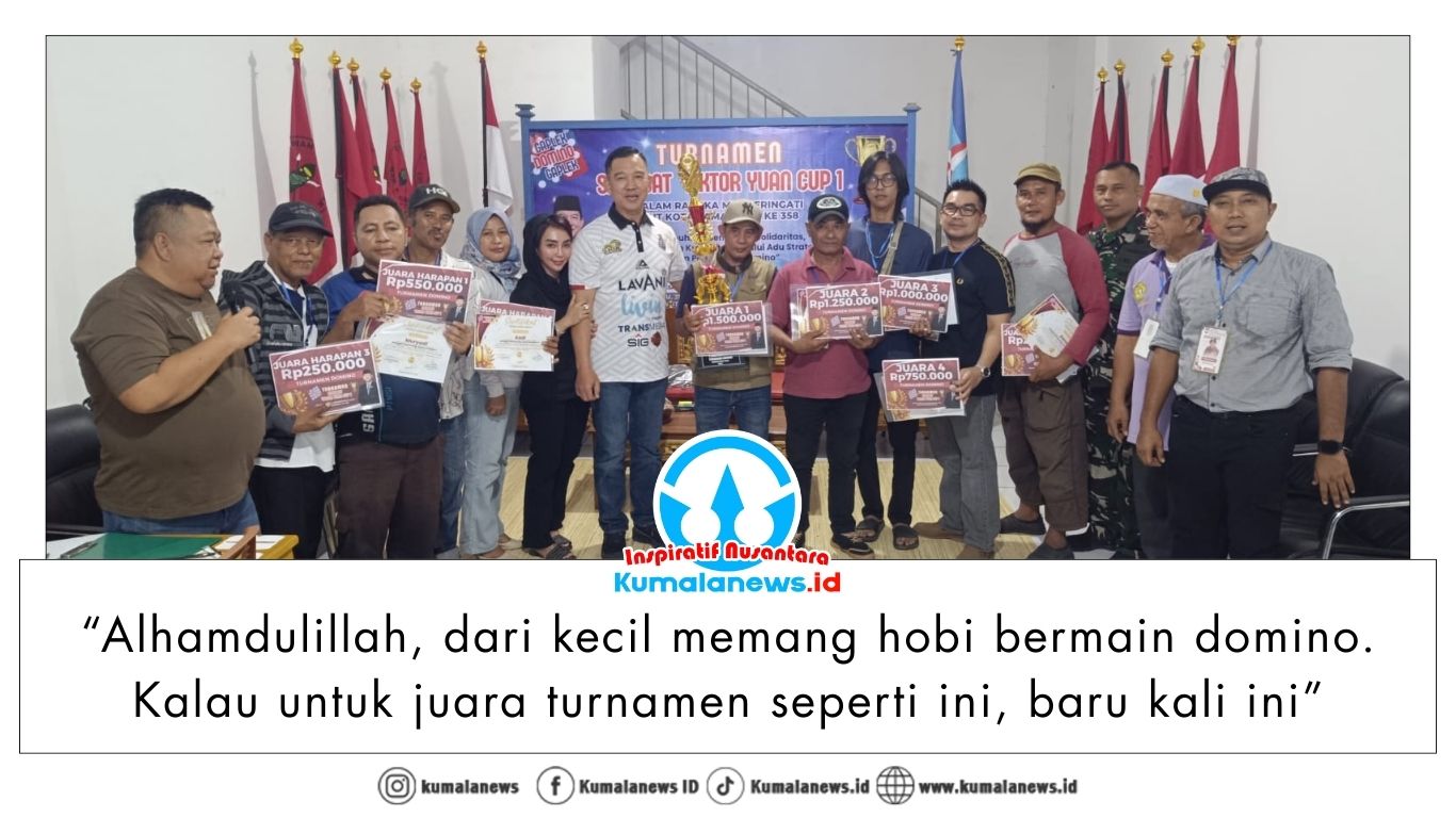 “Alhamdulillah, dari kecil memang hobi bermain domino. Kalau untuk juara turnamen seperti ini, baru kali ini,” ujarnya saat dikonfirmasi media Kumalanews.id.